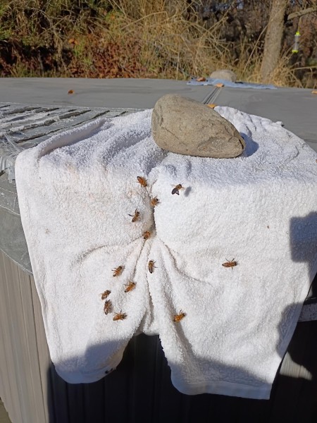 My bees have apparently decided the hot tub is their personal spa. Today they were lined up sucking water off the towel I tossed over the gap like it was a resort drink station. I’ve already had to drain the tub twice this fall because I couldn’t scoop the dead ones out fast enough—they disintegrated and turned the whole thing into “Bee Soup.”